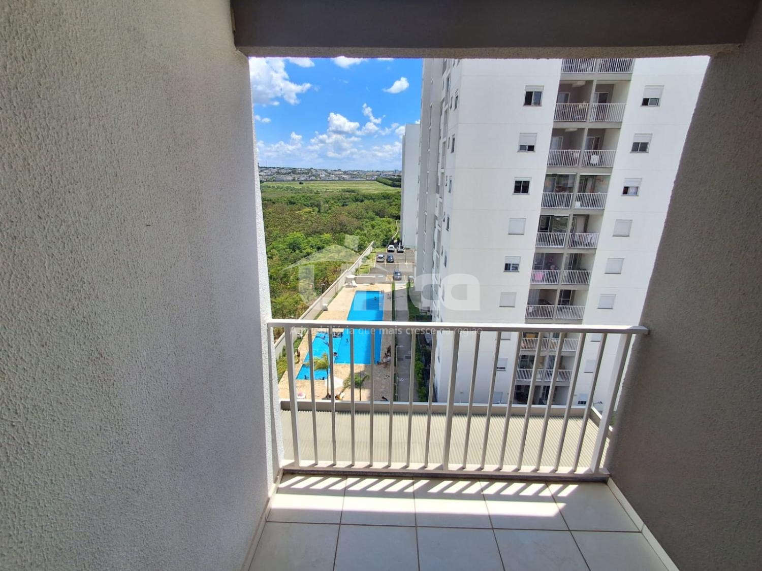* Varanda com **vista para a piscina**
