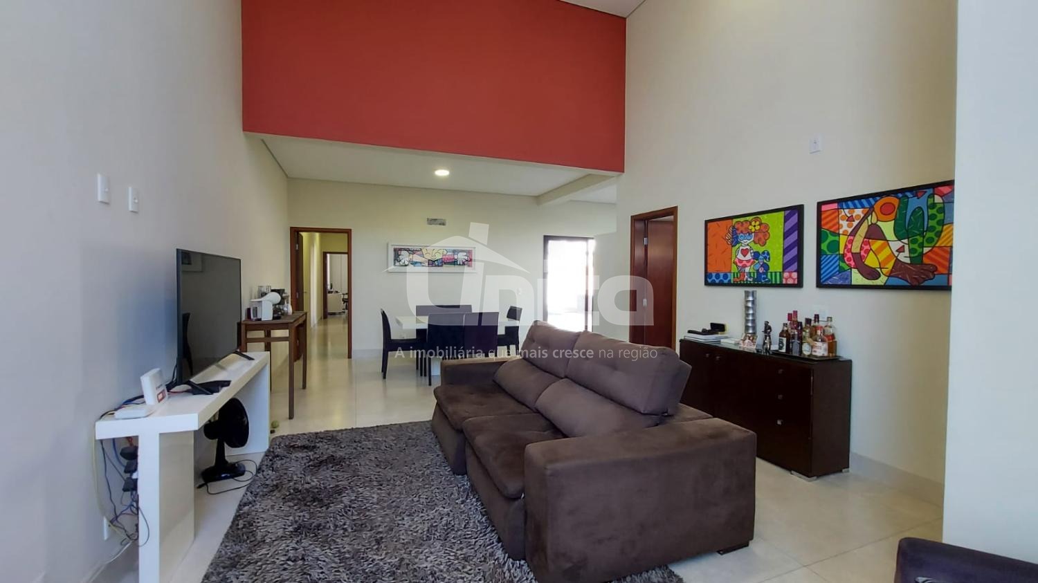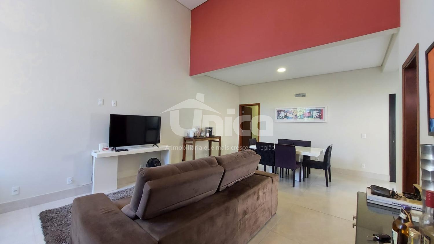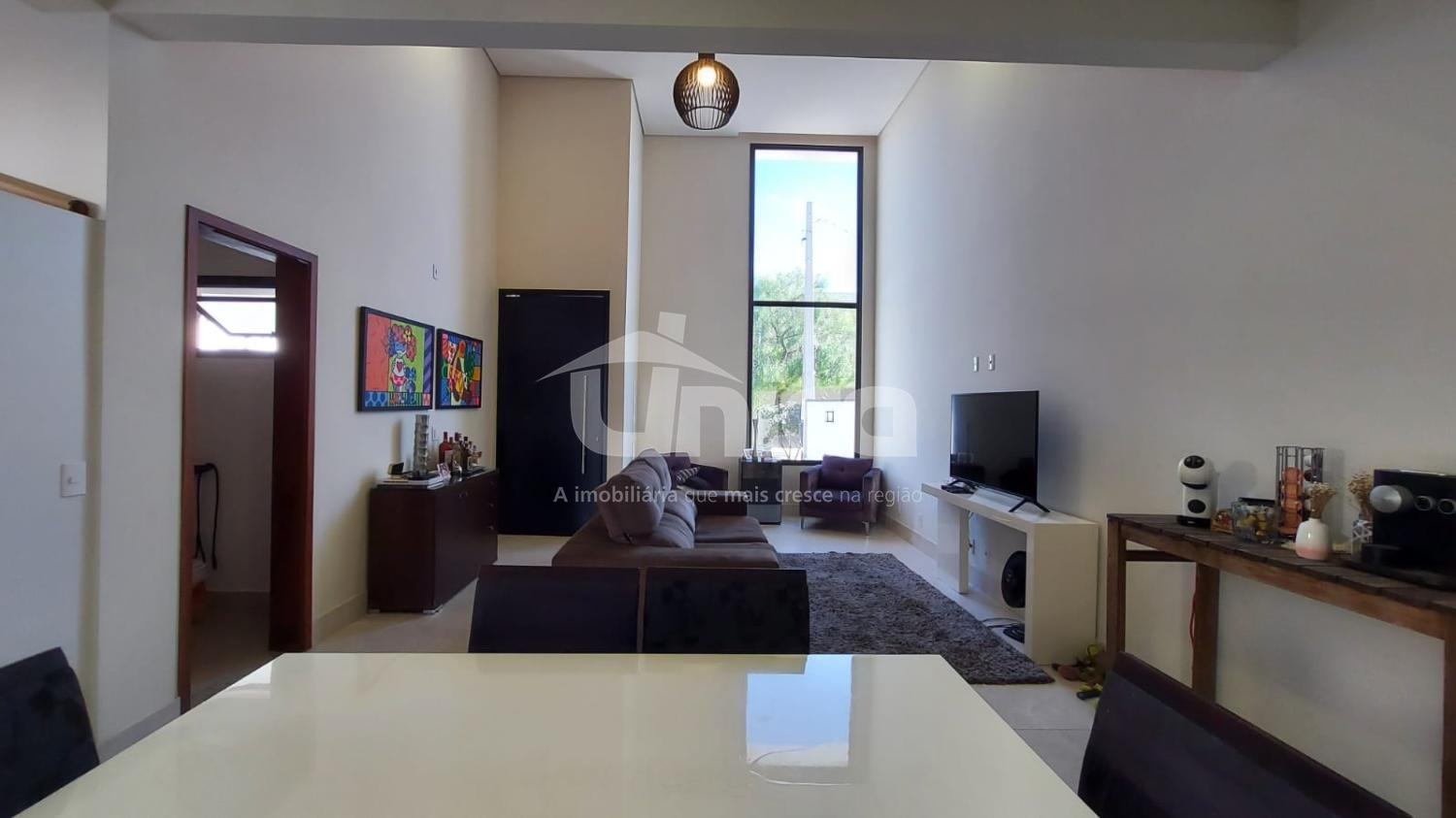 Sala de estar e jantar integradas com pé-direito alto;