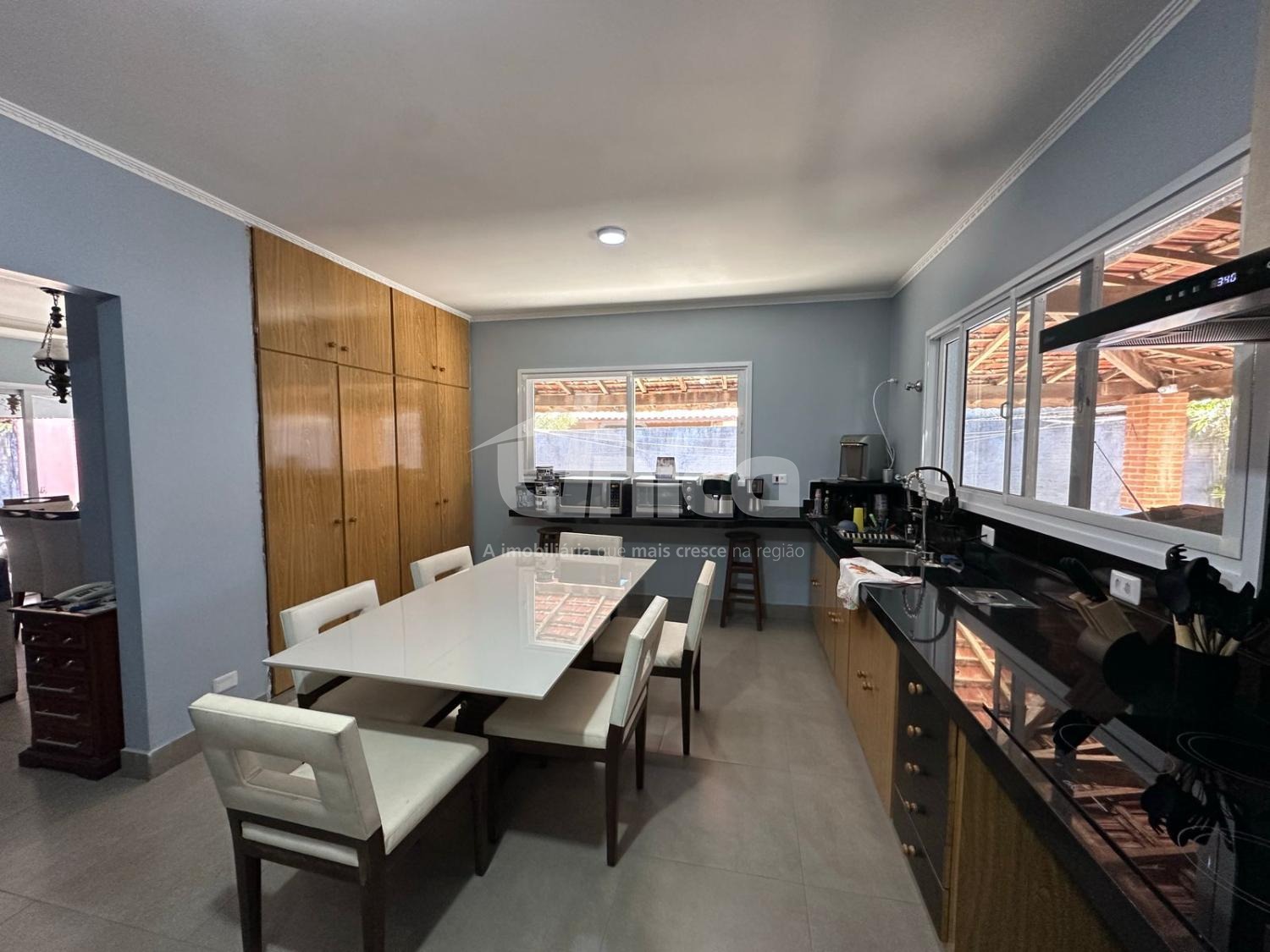 O imóvel possui 3 dormitórios (2 suítes), 1 sala ampla (estar e jantar), 5 banheiros com ótimo acabamento, cozinha planejada, lavanderia, churrasqueira, quintal, varanda, 10 vagas de garagem, excelente ventilação e iluminação natural.